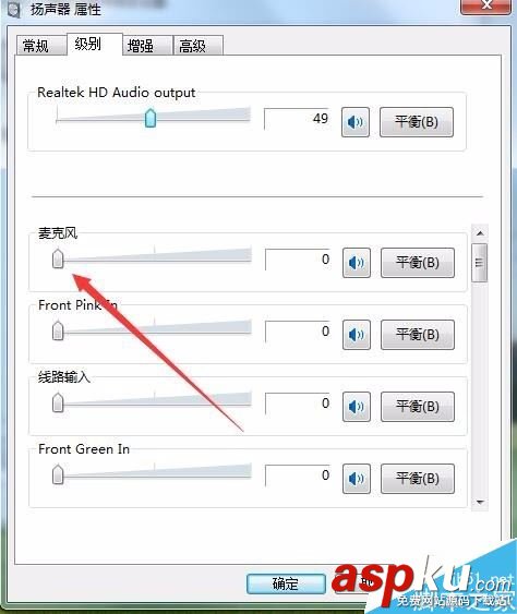 在打開的級別設置窗口中,把“麥克風”一項設置為0,最后點擊確定按鈕 。