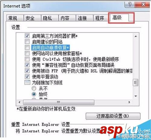 在彈出來的“Internet選項”界面中,切換到“高級”標簽頁中,取消“啟用內存保護幫助減少聯機攻擊”及“啟用自動崩潰恢復”前面的勾。