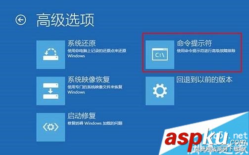 3、點(diǎn)擊“疑難解答”—“高級(jí)選項(xiàng)”—“命令提示符”;