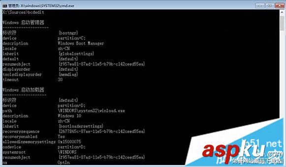 4、在命令提示符窗口,輸入bcdedit按回車(chē)執(zhí)行,記錄resumeobject的字符串,表示修復(fù)對(duì)象的標(biāo)識(shí)符;