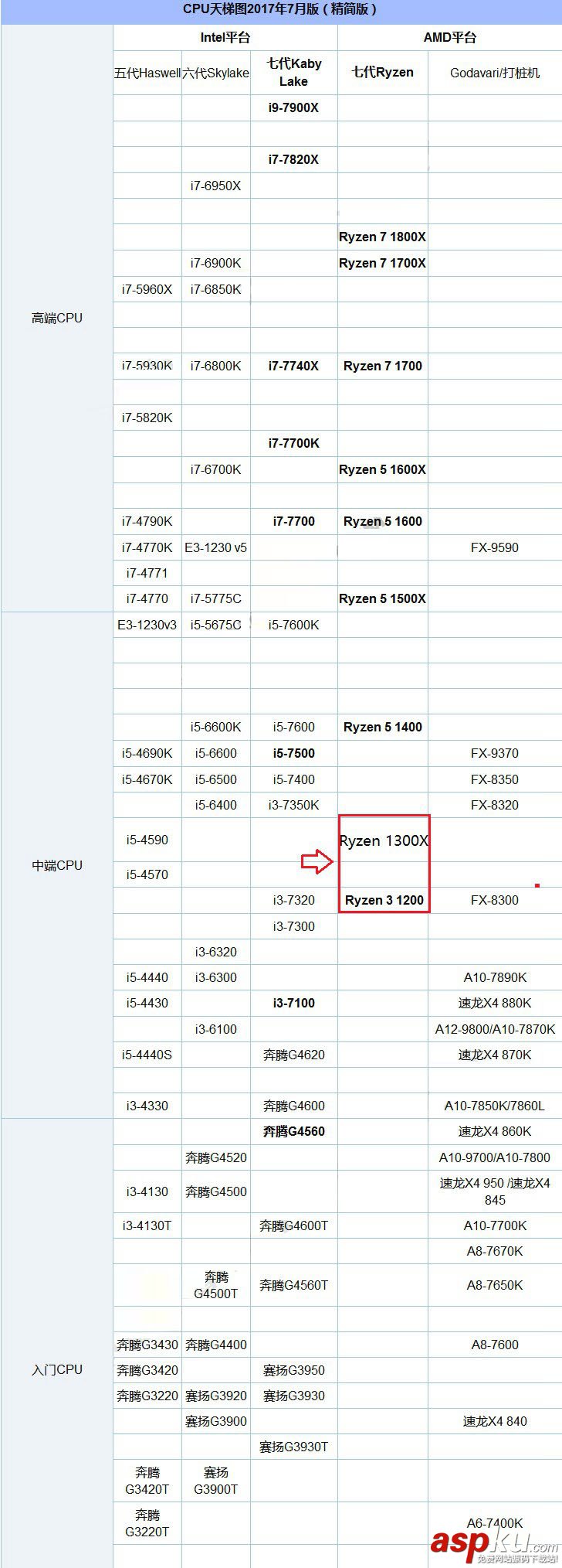 CPU天梯圖2017.8更新,主要是加入了AMD新上市的兩款銳龍R3系列處理器--- Ryzen 3 1200和 Ryzen 3 1300X。性能均為中低端級(jí)別,下面我們來中端介紹下。