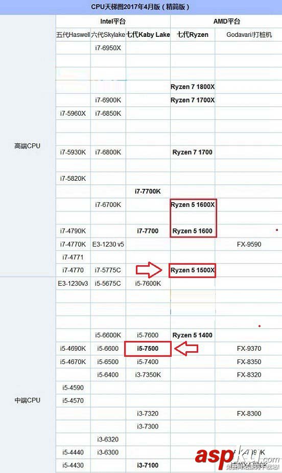 R5 1500X和i5 7500在CPU天梯圖中的性能排行