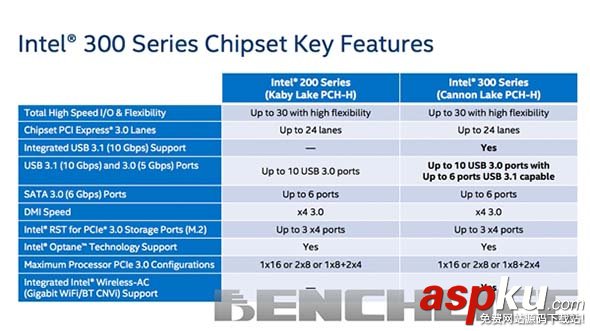 PPT顯示,300系列芯片組相比目前的200系列來說只是增加了原生對USB 3.1的支持(最多可以提供6個USB 3.1接口),同時還原生支持千兆無線網卡,其余規格沒有任何變化。