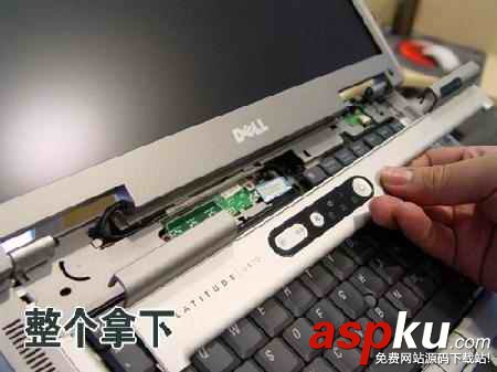 這種鍵盤的固定方式多見于DELL商務機型和日系的筆記本中,從機身后面看不見固定螺絲,拆解時要先把鍵盤上方的壓條拆除。
