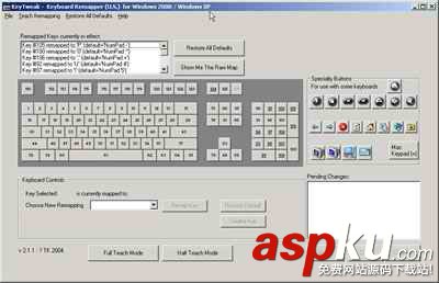 在網上找了半天,終于找到了一個名字叫KeyTweak的小軟件。KeyTweak通過調整操作系統的注冊表來達到將按鍵重映射為另一個按鍵的目的,進而可以將鍵盤某個鍵映射為你的鍵盤上沒有的特殊功能鍵,本來這款軟件是為了讓普通鍵盤變成多功能鍵盤而設計的,但是也正好解決了我們的麻煩,KeyTweakp只有一個主程序,不常駐內存,直接在注冊表中完成按鍵映射功能,重新啟動后就可以使用了。