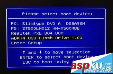 3、這時會彈出啟動項選擇框,以下圖為例,DVD是光驅,USB Flash Drive是U盤,ST500LM012則是本地硬盤,選擇啟動項回車即可;