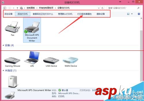 2、點進去后XP跟WIN 7 還有WIN 8 的界面會不一樣,XP的在空白處右鍵選擇 服務器屬性 進入,WIN7跟WIN8的隨便點一臺打印機會在上方出面一條菜單選擇 服務器屬性 進入