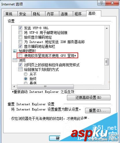 下拉滾動條,取消勾選使用軟件呈現而不使用 GPU 呈現,單擊確定按鈕,重啟計算機即可生效。
