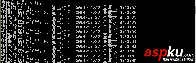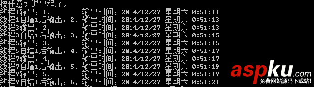 private static object locko = new object(); /// <summary> /// System.Timers.Timer的回調方法 /// </summary> /// <param name="sender"></param> /// <param name="args"></param> private static void TimersTimerHandler(object sender, EventArgs args) { int t = ++num; lock (locko) { Console.WriteLine(string.Format("線程{0}輸出:{1}, 輸出時間:{2}", t, outPut.ToString(), DateTime.Now)); System.Threading.Thread.Sleep(2000); outPut++; Console.WriteLine(string.Format("線程{0}自增1后輸出:{1},輸出時間:{2}", t, outPut.ToString(), DateTime.Now)); } }執行結果: