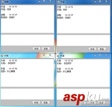 雙方進行聊天時,這里沒有實現(xiàn)像QQ一樣,有人發(fā)信息來在對應(yīng)的客戶端就有消息提醒的功能的, 所以雙方進行聊天的過程中,每個客戶端都需要在在線用戶列表中點擊聊天的對象來激活聊天對話框(意思就是從圖片中可以看出“天涯”客戶端想和劍癡聊天的話,就在“在線用戶”列表雙擊劍癡來激活聊天窗口,同時“劍癡”客戶端也必須雙擊“天涯”來激活聊天窗口,這樣雙方就看到對方發(fā)來的信息了,(不激活窗口,也是發(fā)送了信息,只是沒有一個窗口來進行顯示)),而且從圖片中也可以看出——此程序支持與多人聊天,即天涯同時與“劍癡”和"大地"同時聊天。
