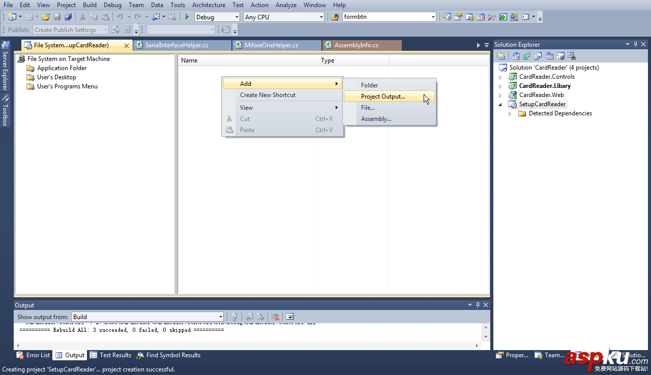 添加完項目輸出以后,在Application Folder里已經有了三個文件:CardReader.Controls.tlb、CardReader.Libary.dll、Primary Output From CardReader.Controls,同時將mwrf32.dll也打進安裝包里,右擊添加文件,瀏覽到mwrf32.dll添加進來即可。注意首先要將mwrf32.dll拷貝到ActiveX控件