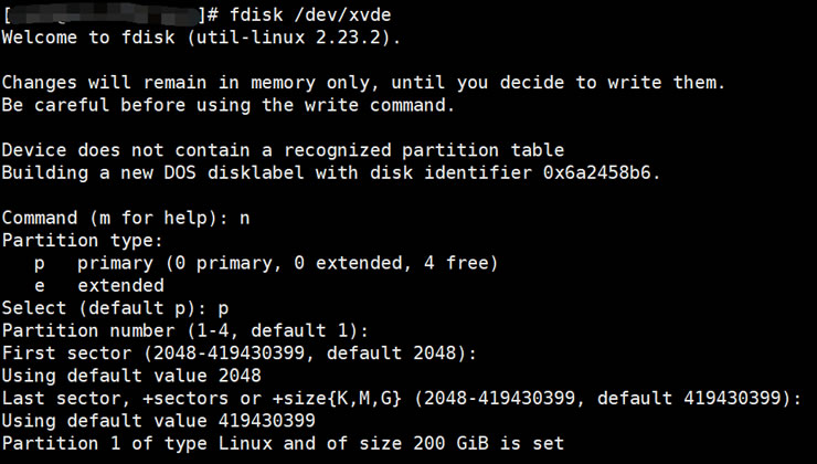 在回顯信息中,輸入n后回車,接下來的操作全部回車默認即可。在上圖中最后回車回顯的信息中告訴我們有一個200G的硬盤分區以及建立好了。