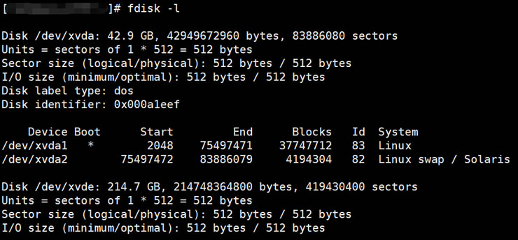 可以看到有兩塊硬盤/dev/xvda和/dev/xvde,啟動xvda是系統盤,xvde是我們新增的數據盤。也就是說系統發現了新增的數據盤/dev/xvde,但并沒有掛載。注意有時候新增數據盤不叫xvde,它有可能叫xvdb。