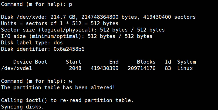 1、執行命令fdisk /dev/xvde,進入fdisk模式,開始對新增數據盤執行分區操作。