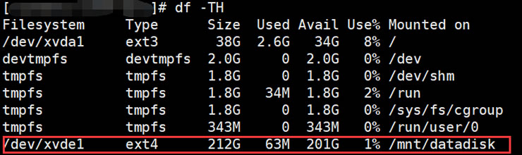 上圖中表示新的磁盤/dev/xvde1已經成功掛載到/mnt/datadisk。