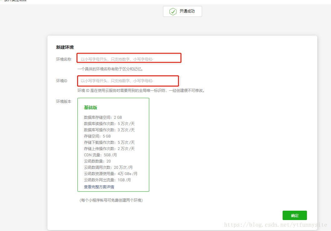 當你開通云服務(wù)的同時,也會讓你給當前項目工程配置數(shù)據(jù)庫的環(huán)境,并給你生成一個環(huán)境ID,這是需要記錄并注意的,要注意的就這個環(huán)境名字是你自己寫的,官方并沒有限制名字長度,但是你一定不要寫太長,6-8位也就差不多夠意思了,不然可能你生成的環(huán)境ID可能會用不了,并且環(huán)境ID只能生成兩個,我還沒看到怎么刪除,所以還是慎重一點,不要在這里浪費時間。