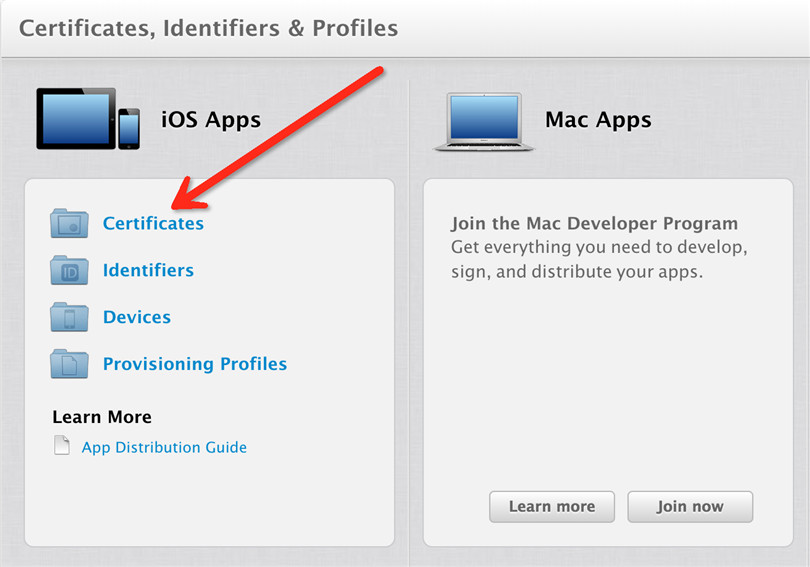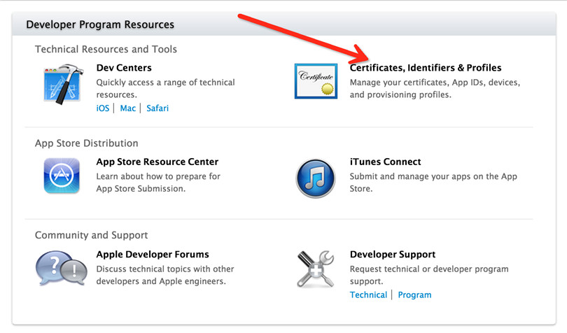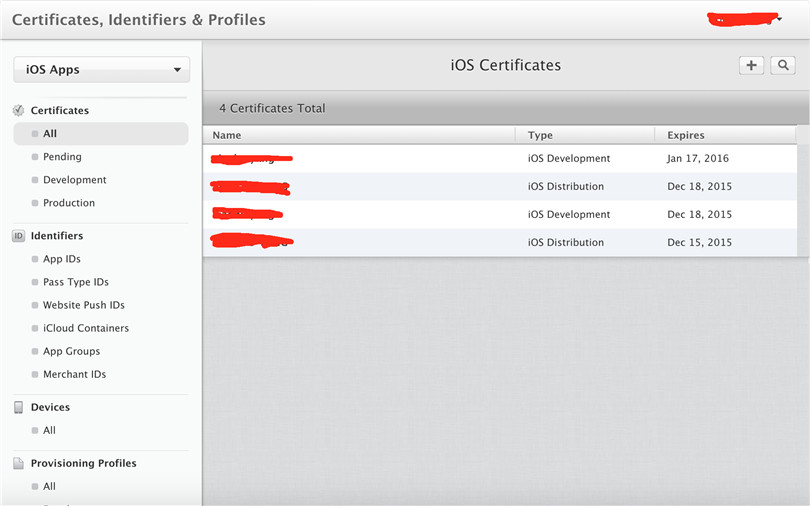 Provider就是我們公司的服務器,經過蘋果的APNs服務器找到我們的設備,給我們設備上的客戶端應用推送消息。那APNs服務器是如何找到我們的設備和設備上的應用呢,答案就是DeviceToken,DeviceToken需要配置推送證書才可以獲得,推送證書需要知道我們的APP ID(應用的BundleID,應用唯一標識)和UDID(設備唯一標識),還有自己服務器的UDID,我們先來打一個推送證書,登錄開發者中心,點擊證書模塊