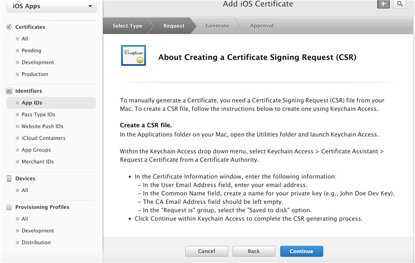 我們需要一個CSR文件,CSR是一個簽名請求文件,意思就是讓我們的MAC具有調試推送的權限,點擊繼續