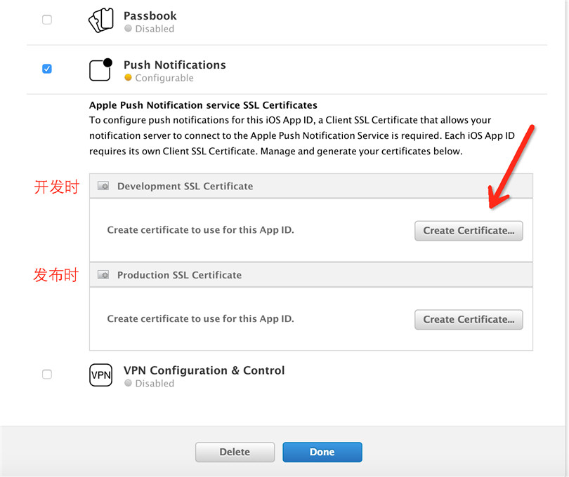 發現Push服務是黃色警告,這時點擊Edit,找到推送模塊,我們需要配置推送證書了,點擊紅色箭頭所指的位置