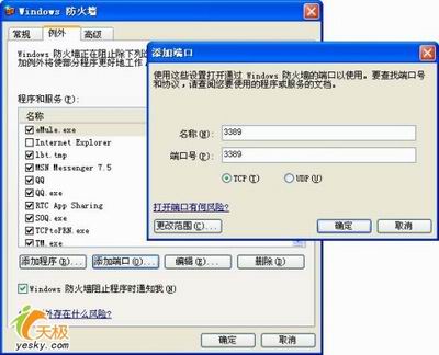 如果開(kāi)啟了Windows XP SP2的防火墻,還必須允許通過(guò)3389端口進(jìn)行連接。具體方法是:依次打開(kāi)“網(wǎng)上鄰居”→“查看網(wǎng)絡(luò)連接”,點(diǎn)擊左上欄中的 “更改Windows防火墻設(shè)置”,在彈出的“Windows防火墻”窗口中,切換到“例外”選項(xiàng)卡,點(diǎn)擊“添加端口”按鈕,在接下來(lái)的窗口中,輸入“名稱”(可隨意命名)和“端口號(hào)”:3389(圖2),確定即可。