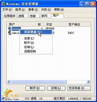 這樣,當(dāng)兩個(gè)不同帳號(hào)的管理員同時(shí)登錄某臺(tái)計(jì)算機(jī),你會(huì)發(fā)現(xiàn)他(她)們之間可以通過(guò)任務(wù)欄右鍵菜單中的“任務(wù)管理器”→“發(fā)送消息”來(lái)互通消息(圖3),方便極了!如果要“來(lái)無(wú)影,去無(wú)蹤”,則必須運(yùn)行“l(fā)ogoff”命令來(lái)注銷。這樣本地用戶關(guān)機(jī)或重啟時(shí)就不會(huì)出現(xiàn)“其他用戶登錄到這臺(tái)計(jì)算機(jī),關(guān)閉Windows會(huì)使他們丟失數(shù)據(jù)。您要繼續(xù)關(guān)機(jī)嗎?”的提示(圖4)。