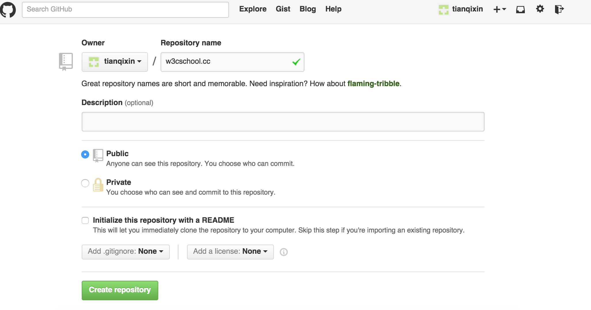 之后在在Repository name 填入 w3cschool.cc(遠(yuǎn)程倉(cāng)庫(kù)名) ,其他保持默認(rèn)設(shè)置,點(diǎn)擊"Create repository"按鈕,就成功地創(chuàng)建了一個(gè)新的Git倉(cāng)庫(kù):