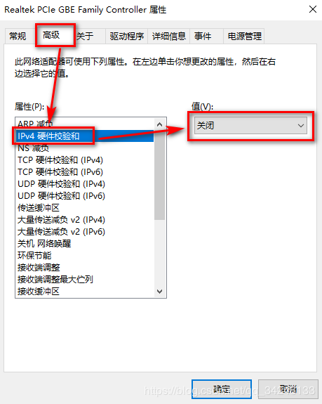4. 在 "高級" 選項卡里把屬性為 "IPv4硬件校驗和" 的值改為 "關閉"