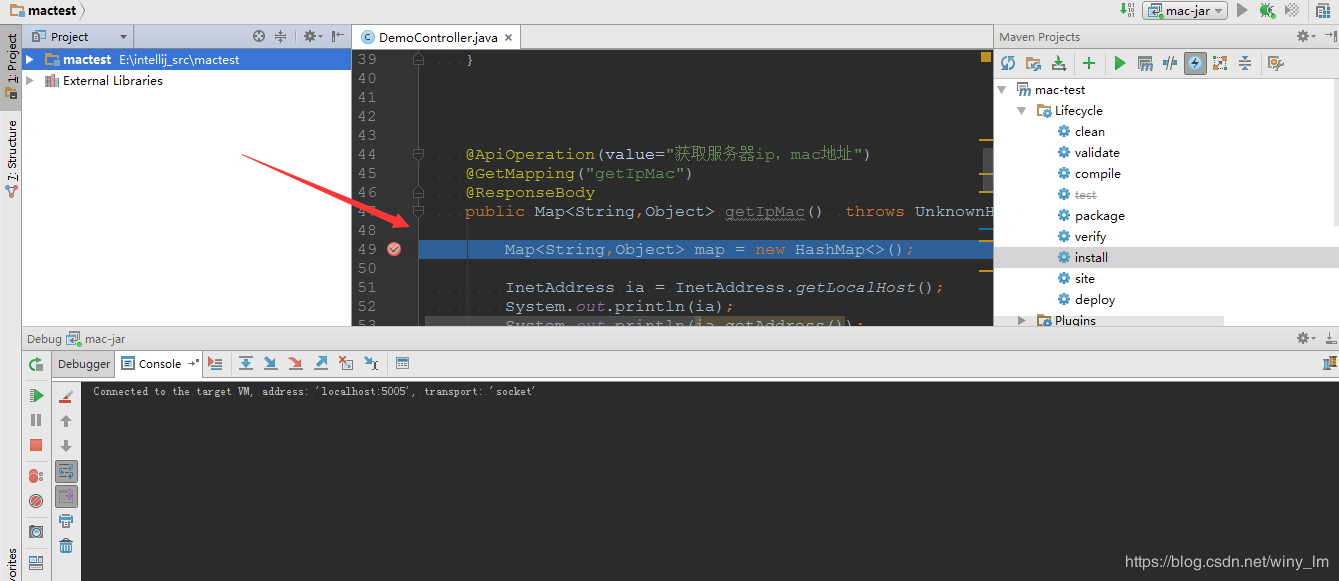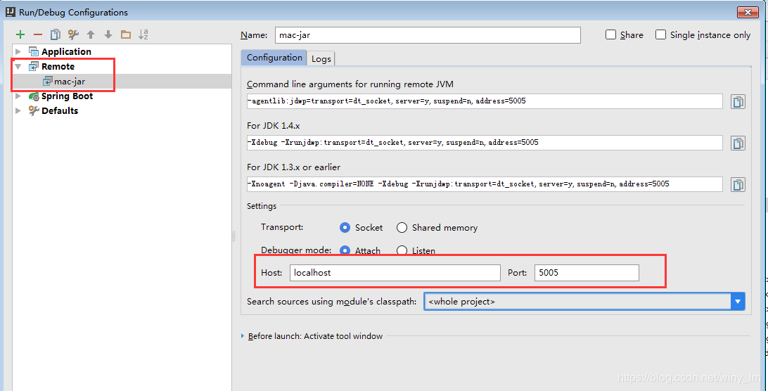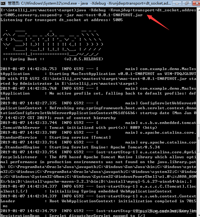 // 找到對應的jar包目錄,cmd窗口中執行下面語句即可java -Xdebug -Xrunjdwp:transport=dt_socket,address=5005,server=y,suspend=n -jar mac-test-0.0.1-SNAPSHOT.jar