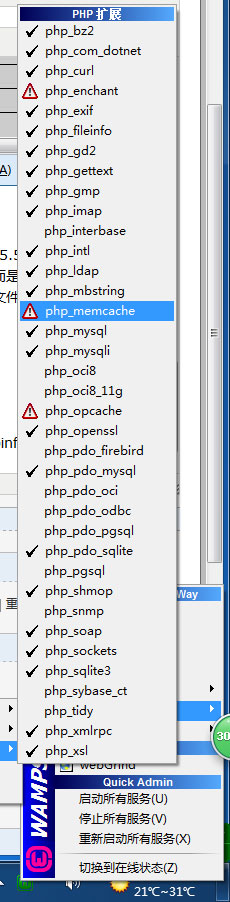 如果你是修改的是php目錄里的php.ini,就會發(fā)現(xiàn)memcache擴(kuò)展并沒有被加載,phpinfo中沒有memcache的信息,打開wamp中的菜單會看見php_memcache擴(kuò)展前面有個紅色嘆號。這是因為 ext 目錄里有這個 dll 擴(kuò)展,而真正的 php.ini 文件里沒有寫這條擴(kuò)展。所以要找到真正的php.ini文件去增加這條擴(kuò)展