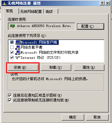 第3步:在打開的網(wǎng)絡(luò)連接屬性中的“常規(guī)”選項卡中,單擊“安裝”按扭。如下圖所示。