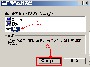 第4步:在選擇網(wǎng)絡(luò)組件類型中,單擊選中"協(xié)議"類型,再單擊左鍵“添加”按扭。