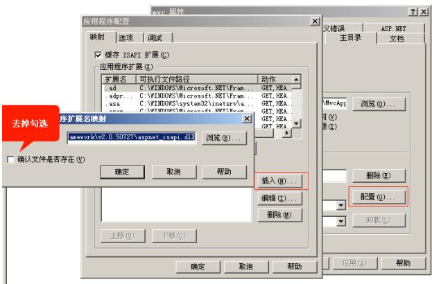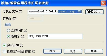 C:/Windows/Microsoft.NET/Framework/v4.0.30319/aspnet_isapi.dll,擴展名為“.mvc”,將“檢查文件是否存在”的勾去掉。參見下圖設置。