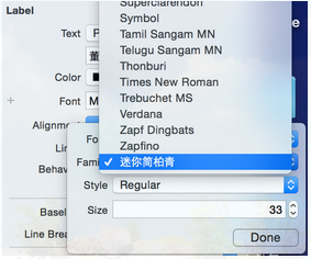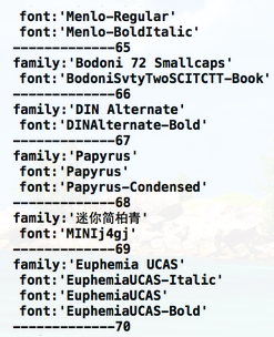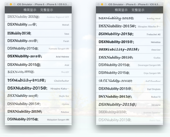 在label中選擇字體的font,并把font由system改成custom后,就能在family中看到72種特殊字體。這些里面就有很炫的字體,但是全部是只針對英文數字,對中文無效。寫了一個程序把所有的原生樣式遍歷出來展示可以達到如下效果。可以清楚地看到每個字體對應的樣式,不用再一個個試了。