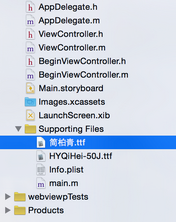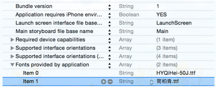 2.修改plist文件,加入Fonts provided by application 配置,后面填上拖進來的項目名