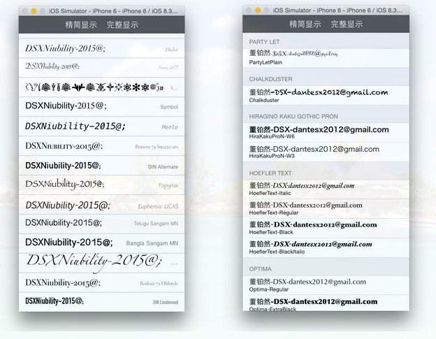一共是72種樣式,我這個demo程序有兩種展示方法,簡潔展示和詳細展示,簡潔展示中只會把每個family的第一個font拿出來展示。最后一張圖是詳細展示界面的。分了group展示,每個section對應一個family。可以看出蘋果的原生字體還是有很多美觀的字體,只是都僅對英文支持。