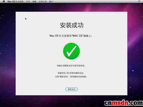 看到下圖的界面,表示你的系統已經安裝完成,需要重新啟動。重新啟動前先要去掉加載的蘋果鏡像,換上Darwin引導鏡像。