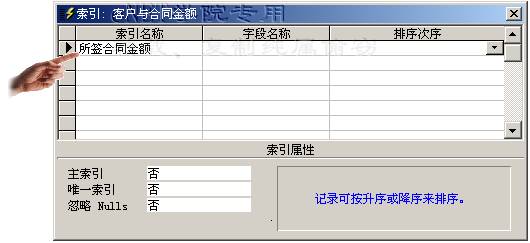 “索引名稱”僅是索引的標識,可以使用索引字段的名稱來命名,或使用具有某種含義的字符串。如,本例將建立“合同金額”索引,以便于以后按合同金額的大小排序來瀏覽數據記錄,所以給出了圖35中所示的索引名稱。