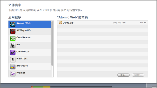 將原型壓縮為 zip 文件,在 iTunes 中上傳壓縮成 zip 的文檔到 Atomic 當中。