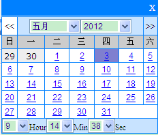 <!--文本框用來接收用戶選中的時間,并且傳給form里的oplog實體類的屬性--> <input type="text" name="oplogSearch.dateBegin" size="16" value="" readonly="readonly" class="textarea1"> <a href="javascript:buildCal(oplogListForm.elements['oplogSearch.dateBegin'],true)"> <img id="IMG1" src="http://localhost:8080/ncmgt//img/public/clock.gif" alt="請選擇日期" wid