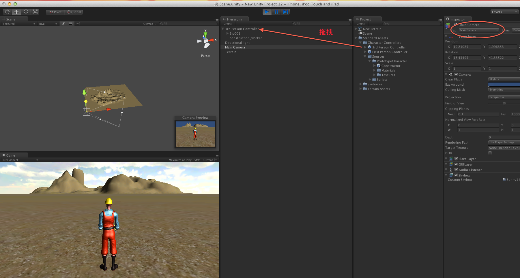 下面我們在看看第三人稱視角,如下圖所示,在Project視圖中將3rd Person Controller拖拽入Hierarchy視圖中。第三人稱視角需要使用我們原有的攝像機,如果剛剛將攝像機的刪掉的話。在Hierarchy視圖中點擊Creat->Camera 即可。然后選擇攝像機,在右側(cè)Inspector視圖中設置它的tag為MainCamera,如下圖所示。最后在Hierarchy視圖中選擇3rd Person Controller,在右側(cè)Inspector視圖中將Third Person Camera 腳本的 Camera Transform 變量綁定上剛剛創(chuàng)建的主攝像機,此時運行游戲后以第三人稱視角移動主角行走與跳躍,攝像機永遠都會在跟隨在后面除非修改角色控制器組件中默認提供的源碼,源碼都在右側(cè)監(jiān)測面板視圖中直接點開就可以查看。