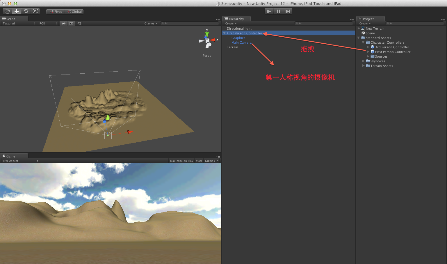 如下圖所示,我們將FirstPerson Controller拖拽入Hierarchy(層次視圖)中。由于角色控制器是具有一定物理引擎的,所以一定要將它放在地形或面對象之上,否則當它接收物理效果時發(fā)現(xiàn)地面沒有東西支撐它,它就會掉下去。然后運行游戲你就會發(fā)現(xiàn)和CS中的第一人稱效果非常相像, W、S、A、D移動人物行走,移動鼠標更改行走的方向,空格鍵人物會跳躍。