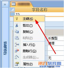 4、在彈出的菜單中,我們選擇 主鍵。這樣就給ID這個字段建立的主鍵。