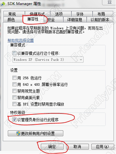 2) 在SDK Manager 快捷方式的屬性對(duì)話框,點(diǎn)擊“兼容性”的選項(xiàng)卡,選中“以管理員身份運(yùn)行此程序”,如下圖所示: