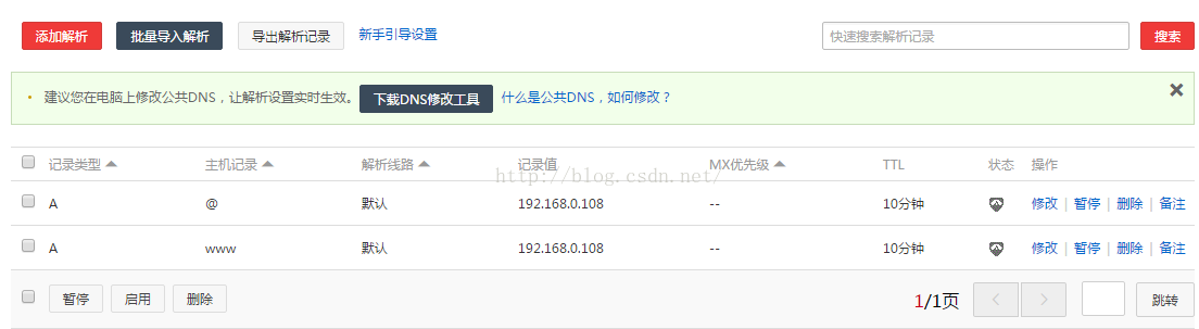 先前申請過阿里云的域名,只要進入管理平臺找到域名解析,將本地ip添加到域名解析中即可。