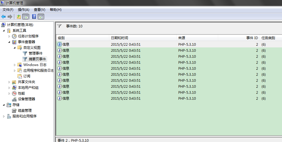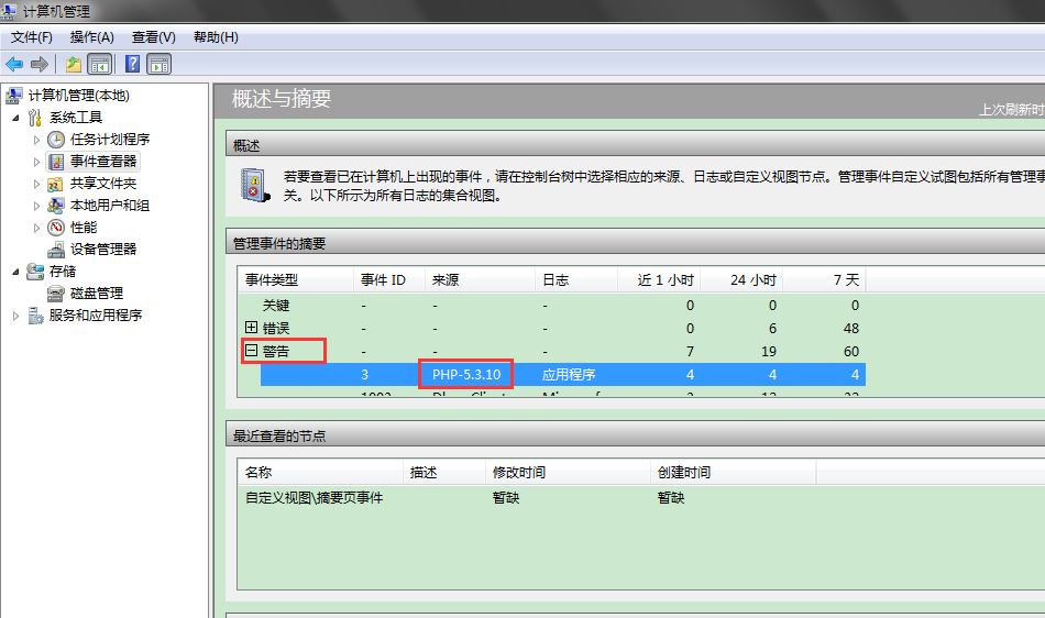 1 2 3 4 5 6 7 8 9 10 11 12 13 14 15 16 <?php //關閉錯誤顯示 ini_set('display_errors', 0); //開啟錯誤日志功能 ini_set('log_errors', 'on'); //設置錯誤日志的路徑 ini_set('error_log', 'syslog'); //顯示所有錯誤 error_reporting(-1);在事件查看器的警告信息中也能看到日志: