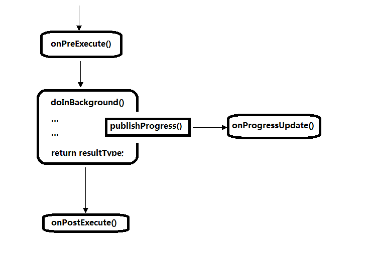 onPreExecute():執行在UI線程上調用執行任務之前,一般用于設置任務。 doInBackground(Params...):主要是用來執行異步任務的耗時操作,可以在這個方法中通過publishProgress()方法發布進度信息,并在執行完成之后,返回執行結果。 onProgreddUpdate(Progress...):在UI線程上接受doInBackground()傳遞過來的進度信息,并在UI線程上展示進度信息,它執行的時機是不確定的。 onPostExecute(Result):在UI線程上操作doInBackground()執行的返回值。上面介紹的四個步驟的示意圖: