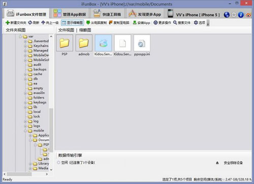 因?yàn)閕OS設(shè)備不能像Android一樣方便地管理機(jī)內(nèi)的文件,所以我們拷入游戲鏡像的時(shí)候需要借助到其他工具,這里以iFunBox為例,把游戲鏡像ISO(CSO)放入//car/mobile/documents目錄,如圖所示