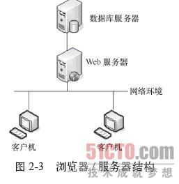 瀏覽器/服務(wù)器(Browser/Server,B/S)結(jié)構(gòu)是3層結(jié)構(gòu),如圖2-3所示。在B/S結(jié)構(gòu)中,客戶端只需要安裝瀏覽器就可以了,不需要安裝具體的應(yīng)用程序;中間的Web服務(wù)器層是連接前端客戶機(jī)與后臺(tái)數(shù)據(jù)庫服務(wù)器的橋梁,所有的數(shù)據(jù)計(jì)算和應(yīng)用邏輯處理都在此層實(shí)現(xiàn)。用戶通過瀏覽器輸入請(qǐng)求,傳到Web服務(wù)器進(jìn)行處理。如果需要,Web服務(wù)器與數(shù)據(jù)庫服務(wù)器進(jìn)行交互,再將處理結(jié)果返回給用戶。