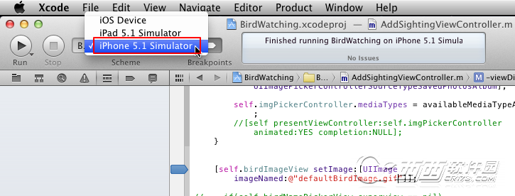 比如我此處的項目是針對iPhone的,所以設置為iPhone 5.1 Simulator: