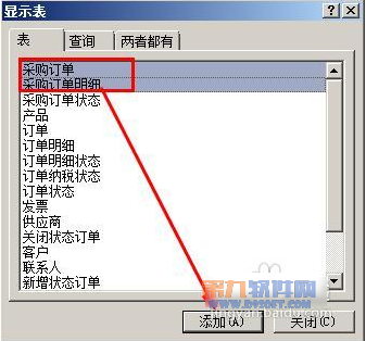2、彈出了顯示表的對話框,這里你要選擇作為數據源的表,我選擇的是采購訂單和此阿狗訂單明細,然后點擊添加,最后點擊右上角的關閉按鈕